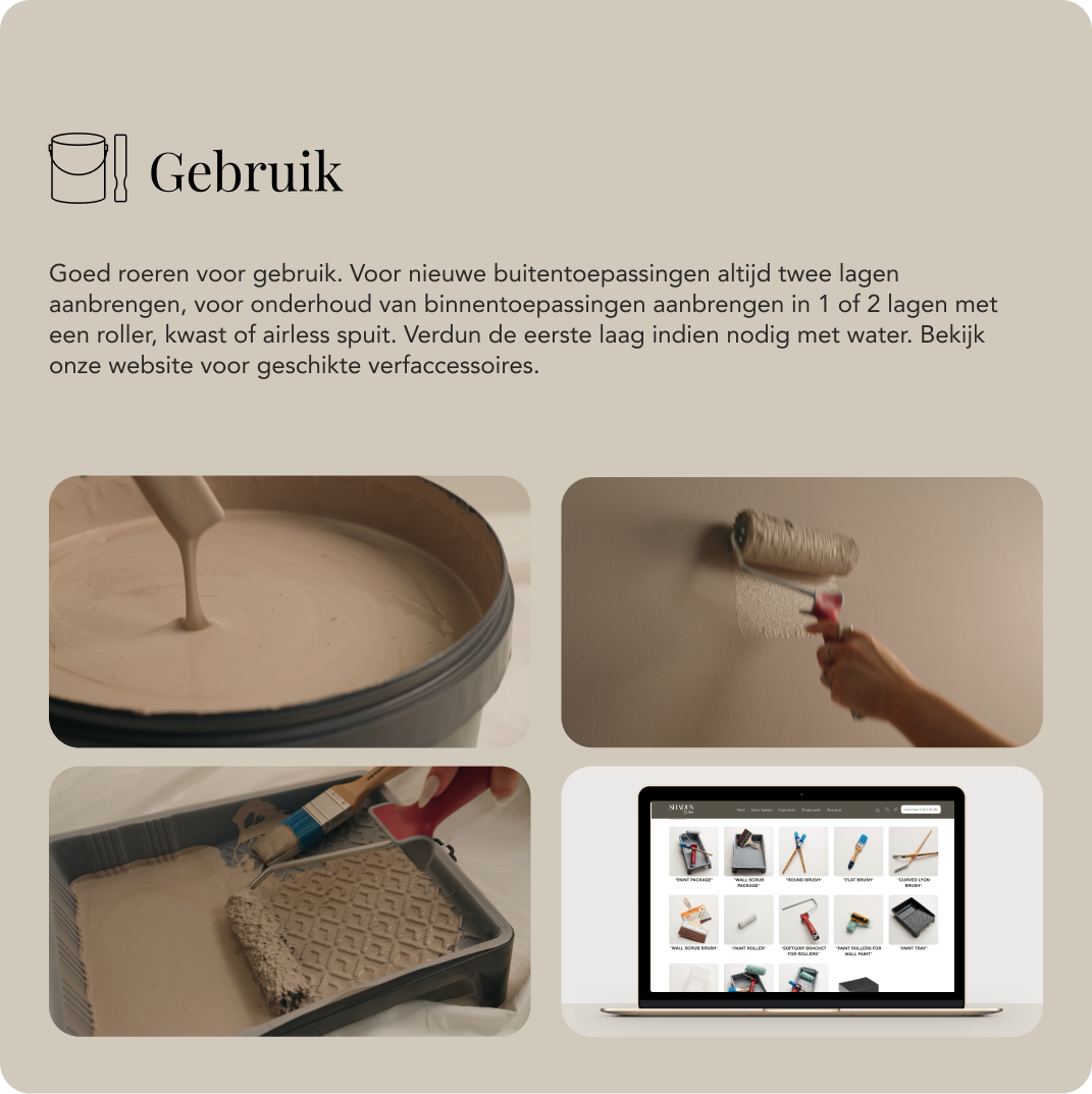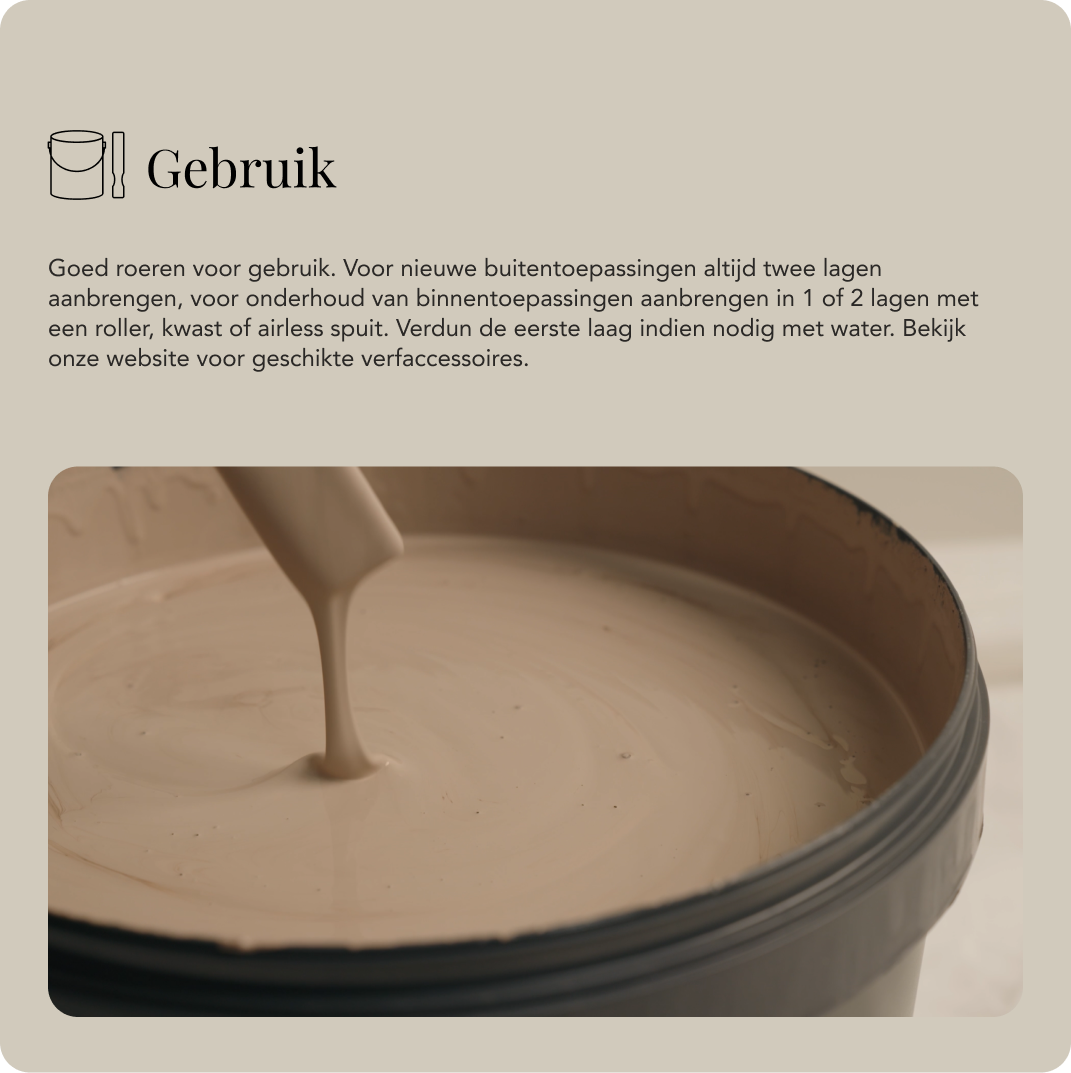 Goed roeren voor gebruik. Voor nieuwe buitentoepassingen altijd twee lagen aanbrengen, voor onderhoud van binnentoepassingen aanbrengen in 1 of 2 lagen met een roller, kwast of airless spuit. Indien nodig de eerste laag verdunnen met water. Verder op deze pagina vind je de geschikte schilderaccessoires.